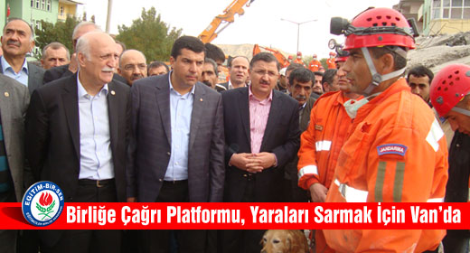 TOBB Baskani M. Rifat Hisarciklioglu, Egitim-Bir-Sen ve Memur-Sen Genel Baskani Ahmet Gündogdu ve toplumun her kesiminin temsilcilerinden olusan Birlige Çagri Platformu’nun 78 üyesi, depremin yaralarinin bir an önce sarilmasi için Van’a gitti. Hisarciklioglu, Van’da birlik ve beraberlik mesaji vererek, “Kardeslerimizin her zaman yanindayiz. Insanlar zor günlerde birbirlerine nasil simsiki sarildiklarini göstermelidir” dedi.