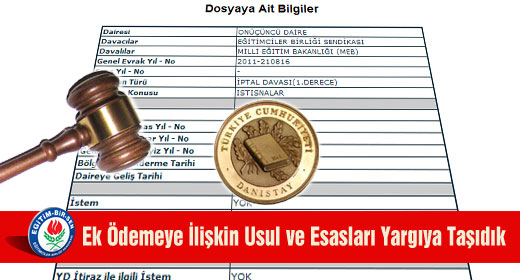 “Milli Egitim Bakanligi Personeline Yapilacak Ek Ödemeye Iliskin Usul ve Esaslar”in çalisanlar arasinda ayrimcilik getiren, hak kaybina yol açan ve bir kisim personeli kapsam disinda birakan ve beklenen oranlarin altinda ek ödeme getiren bazi kisimlarinin öncelikle yürütmesinin durdurulmasi ve akabinde iptali talepli dava açmis bulunmaktayiz. Söz konusu dava bugün (28/10/2011) itibariyle Danistay Baskanligi’nin 2011/210816 genel evrak numarasina kaydedilmis olup Danistay 13. Dairesi’nde görülecektir. Dava, yürütmenin durdurulmasi ve “durusma” istemli olarak açilmis olup, durusma safhasinda da eksik ve hatali düzenlemeler ile hak kayiplari ayrintili bir sekilde mahkeme heyetine izah edilebilecektir.