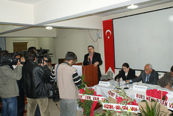 Ilin en etkili ve yetkili sendikalari olarak önümüzdeki dönemde hem çalisanlara ve hem de halka karsi sorumluluklarini yerine getirmeye devam edeceklerini kaydeden Okçu, “Vanimiz sahip oldugu zenginlikler itibariyle bölgemizin en sansli ili konumundadir. Ne yazik ki, ilimize atanan memurlar stajyer, ögretmenler, daire amirleri, mülki amirlerin stajyer olmasi gelismeye engel teskil etmektedir. Van adeta acemi ocagina dönüstürülmüstür. Hal böyleyken tecrübesizlikten kaynakli olarak yetkiler birbirine karismis, bürokrasi kilitlenmistir. Sonuçta Van acemi yöneticiler elinde can çekismektedir” diye konustu.