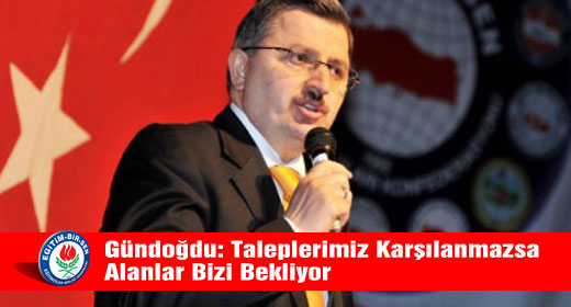 Egitim-Bir-Sen ve Memur-Sen Genel Baskani Ahmet Gündogdu referandumdan bu yana 15 ay geçmesine ragmen halen çikmayan yasanin meclis yilbasi tatiline girerken gündeme gelmesini elestirdi. Gündogdu, yasa 15 Ocak’a yetisemedigi için tüm çalisanlarin, memurlarin zamli maas alamayacagini söyledi. Gündogdu, “Meclis çok çalisiyor 15 ayda bizim yasamiz meclise hala gelmedi, ama bir ayda iki kez çikan yasalar var. Simdi de meclis çok yoruldu tatile giriyor. 15 Ocak geliyor. Su anda hem isçiler, yasalari dolayisiyla, beklenti içerisinde; hem 2.5 milyon memur, milyonlarca emekli beklenti içerisinde. Milyonlarca memur 15 Ocak maas bordrosuna bakacak; ama su anda bunun 15 Ocak’a yetismeyecegi neredeyse kesinlesmis gözüküyor. Bu ne kadar isi ciddiye almak. Bir taraftan meclisi tatil ederken diger taraftan da yasayi bugün gönderiyoruz yaklasimi ne kadar uyumlu bunu da kamuoyunun vicdanina birakiyorum” diye konustu. Memur maaslarinin, toplu sözlesme masasinin isi oldugunu belirten Gündogdu, “Eger uzlasabilirsek uzlasma sonucu 1 Ocak’tan geçerli olarak yansitilmalidir; uzlasamazsak Kamu Görevlileri Hakem Kurulu’nun verecegi karar kesin olmalidir. Eger bu taleplerimiz karsilanmazsa alanlar bizi bekliyor” dedi.