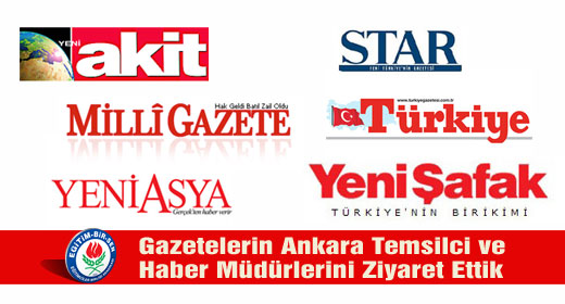 Yeni Safak Gazetesi Ankara Haber Müdürü Kazim Canlan ve Egitim Muhabiri Fazli Sahan, Yeni Akit Ankara Temsilcisi Yener Dönmez ve Egitim Muhabiri Hasan Tosun, Yeni Asya Gazetesi Ankara Temsilcisi Mehmet Kara ve Haber Müdürü Umut Yavuz, Türkiye Gazetesi Ankara Haber Müdürü Akif Bülbül ve Egitim Muhabiri Gökhan Kaya, Milli Gazete Ankara Temsilcisi Mustafa Yilmaz ve Yazari Ebubekir Gülüm, Star Gazetesi Ankara Haber Müdürü Cevheri Güven ve Egitim Muhabiri A. Fatih Erturan’i makamlarinda ziyaret eden Genel Basin Yayin Sekreterimiz Ali Yalçin ve Basin Müsavirimiz Hakan Sögüt, egitim çalisanlarinin sorunlarini ve sendika olarak yaptigimiz çalismalari paylasti.