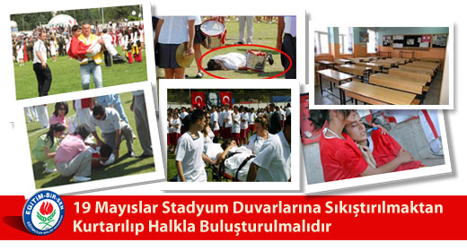 19 Mayis, stadyum duvarlari arasina sikistirilmamali, tüm toplum kesimlerine açik hale getirilmeli; egitimciler ve ögrenciler, egitim süreci içerisine serpistirilmis seremonilerle zaman kaybetmekten kurtarilmalidir.