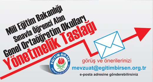 Katilimci anlayisin geregi olarak paydas kuruluslarin yönetmelige iliskin önerilerini almak için sendikamiza gönderilen, ekte PDF olarak sundugumuz Mili Egitim Bakanligi Sinavla Ögrenci Alan Genel Ortaögretim Okullari Yönetmelik Taslagi için önerilerinizi en geç 19.01.2012 tarihi mesai bitimine kadar mevzuat@egitimbirsen.org.tr adresine gönderebilirsiniz.