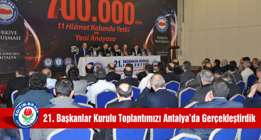 21. Baskanlar Kurulu Toplantimizi Antalya-Side’de yaptik. 2012’nin yol haritasinin çizilip stratejilerin belirlendigi toplantida, basta Yeni Anayasa ve toplu sözlesme yasasi olmak üzere, teskilat içi konular ile güncel meseleler üzerinde duruldu. Toplantida konusan Genel Baskanimiz Ahmet Gündogdu, Egitim-Bir-Sen’in geçen yil itibariyle genel yetkili sendika oldugunu hatirlatarak, “Amaç ve degerlerimizin hakkini vermek için sinirlarimizi zorladik, bedelini ödemeye çalistik. Egitim-Bir-Sen tarafindan temsil edilmis deger ve ideallerin savunucusu olarak her türden yeni olgu ve gelismeleri dogru yorumladik, gerektiginde mücadelemizi en etkili sekilde sürdürdük ve nihayetinde de hakkimiz olan yetkiyi aldik. Yetkiyi almada emegi geçen bütün teskilatimiza çok tesekkür ediyorum” dedi.