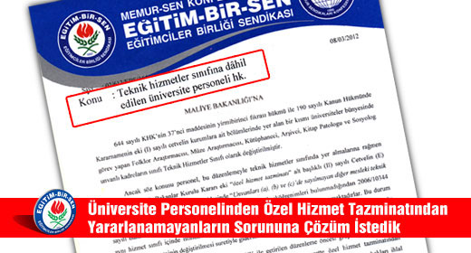 Maliye Bakanligi’na yazili müracaatta bulunarak, görev yaptiklari kurum ayrimi yapilmaksizin “Folklor Arastirmacisi, Müze Arastirmacisi, Kütüphaneci, Arsivci, Kitap Patologu ve Sosyolog” unvanli kadrolarinda görev yapan personelin, 2006/10344 sayili Bakanlar Kurulu Karari eki (II) sayili Cetvelin (E) Teknik Hizmetler Bölümü’nün 1/d maddesi kapsaminda özel hizmet tazminatlarindan yararlandirilmasini istedik.
