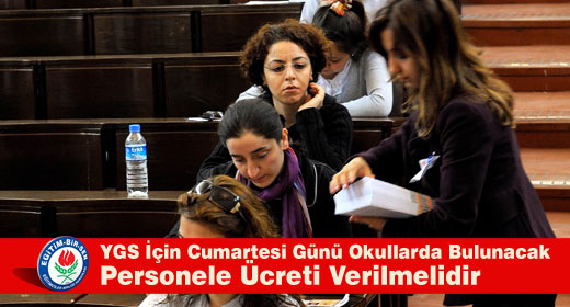 01/04/2012 Pazar günü Yüksekögretime Geçis Sinavi (YGS) yapilacak. Sinav nedeniyle Ölçme, Seçme ve Yerlestirme Merkezi Baskanligi (ÖSYM) tarafindan 28/03/2012 tarihinde yayimlanan basin duyurusunda “Adaylarin sinava girecekleri binayi ve salonu sinav gününden önce görmelerinin yararlarina olacagi; sinav binalarinin 31 Mart 2012 tarihi saat 10.00’dan 16.00’a kadar açik tutulacagi” bildirilmis, ancak, o gün okullarda bu hizmetin kim tarafindan sunulacagi ve hizmet sunacaklarin ücreti açiklanmamistir. Sinav bina ve salonlarinin anilan saatler arasinda açik tutulabilmesi ve sinav salonlarinin görülebilmesi; bu isle görevlendirilecek olan ögretmenler basta olmak üzere egitim personelinin olagan mesai saati baslangicinda okullarina gelmeleri ve sinav güvenliginin temini için sinav salonlarinin kontrolü gibi sebeplerle belki de olagan mesai saati sonrasina kadar okullarinda bulunmasini gerektirecek ve bu nedenle ögretmenler ve diger egitim çalisanlari söz konusu tarihte tam gün çalismak zorunda kalabilecektir. Zira sinav güvenligi için okullarin yeteri kadar personelin rehberligi ve gözetiminde adaylara gezdirilmesi gerekmektedir. ÖSYM’ye bir yazi göndererek, YGS’nin yapilacagi egitim kurumlarinda görev yapacak olan yöneticiler, ögretmenlere ve personele fazla mesai ücreti ödenmesini istedik.