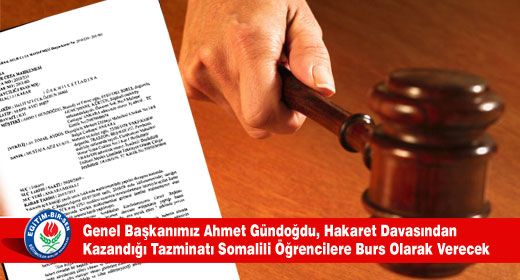 Memur-Sen ve Egitim-Bir-Sen Genel Baskani Ahmet Gündogdu’nun, bir internet sitesinde kendisinin yaptigi bir basin açiklamasinin altina, ailesine agir ifadeler ve hakaret içeren yorum yazilmasi nedeniyle açtigi davada, hakaret eden sahsa, sulh ceza mahkemesi 1.740 TL adli para, asliye hukuk mahkemesi ise 1.500 TL manevi tazminat cezasi verdi. Gündogdu, kazandigi tazminati üniversite egitimlerini tamamlamak için Somali’den Türkiye’ye getirilen Somalili ögrencilere burs olarak verecegini açikladi.