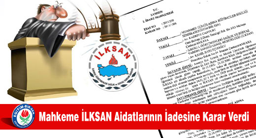 Amasya Kiz Teknik ve Meslek Lisesinde Ögretmen olarak görev yapan üyemiz, ILKSAN üyelik aidatlarinin iadesi istemiyle açtigi davada Mahkemece hakli bulundu. Üyemiz, ILKSAN’a Diyarbakir ili Lice ilçesi Kumluca Köyü Ilkögretim Okulu’nda Sinif Ögretmeni olarak görev yaptigi 10.10.1995-21.02.2000 arasi dönem zarfinda maasindan yapilan ILKSAN üyelik kesintilerinin (üyeligi devam etse idi emekliye ayrilirken alacagi maddi yardim ölçü alinarak hesaplanmak suretiyle) yasal faizi ile birlikte ödenmesi istemiyle basvuruda bulunmustu. Yapilan basvuru 24.01.2011 tarih ve 1019 sayili kararla/islemle ILKSAN tarafindan reddedilmistir. Söz konusu islemin usul ve hukuka aykiri olmasi nedeniyle islemin iptali, üyemizden ILKSAN adina yapilan aidat kesintilerinin kesinti tarihinden itibaren yasal faizi ile birlikte ödenmesi istemiyle üyemiz adina davada, Samsun 2. Idare Mahkemesi, ILKSAN’in islemini hukuka aykiri bularak dava konusu islemi iptal etti.