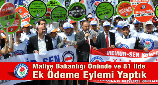 Genel Merkez olarak Ankara subelerimizle birlikte Maliye Bakanligi önünde eylem yaparken, subelerimiz de il merkezlerindeki PTT önlerinde kitlesel basin açiklamalari ve faks eylemleri gerçeklestirdi. Ilçe temsilciliklerimiz ise, ilçelerden “ek ödeme” talebimizi içeren faks metinlerini, basta Basbakan Recep Tayyip Erdogan olmak üzere, Ekonomiden Sorumlu Devlet Bakani ve Basbakan Yardimcisi Ali Babacan’a, Maliye Bakani Mehmet Simsek’e, Çalisma ve Sosyal Güvenlik Bakani Faruk Çelik’e, çalisanlarina sahip çikmasi talebiyle Milli Egitim Bakani Ömer Dinçer’e ve kendi illerinin milletvekillerine gönderdiler.