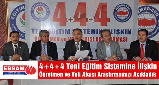 Yeni egitim sisteminin, ögretmenler ve veliler tarafindan nasil algilandigini tespit etmek amaciyla 7-25 Nisan 2012 tarihleri arasinda 12 ilde, 1200 ögretmen ve 1200 veli ile yüz yüze gerçeklestirdigimiz “4+4+4 Yeni Egitim Sistemine Iliskin Ögretmen ve Veli Algisi” arastirmamizi açikladik.