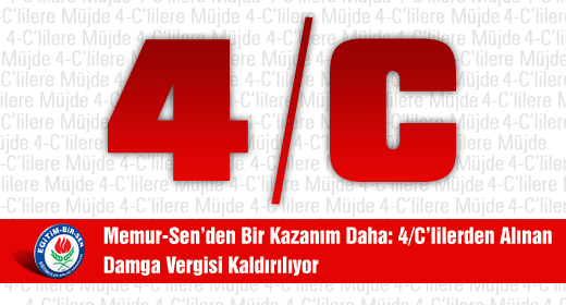 Kamu isveren heyeti ile kamu çalisanlari arasinda bu yil ilk kez yapilan toplu sözlesme süreci devam ederken, Maliye Bakanligi’ndan 4/C’lileri sevindirecek bir haber geldi. 2010 toplu görüsmelerinde Memur-Sen’in masaya getirdigi damga vergisinin kaldirilmasi talebi netlige kavustu. Maliye Bakanligi Müstesari Naci Agbal’in konuyla ilgili yaptigi açiklamaya göre, 4/C’lilerden alinan damga vergisi kaldirilacak. Agbal, “Hazirliklarimizi bitirdik, en kisa zamanda uygulamaya koyacagiz” açiklamasini yapti.