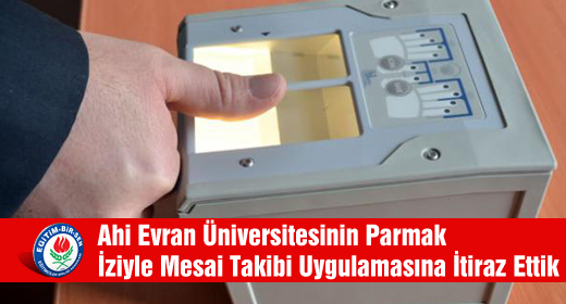Ahi Evran Üniversitesinde bir süre önce baslatilan parmak iziyle mesai takibi yapilmasina iliskin Personel Devam Kontrol Sistemi (PDKS) uygulamasina, evrensel hukuk ilkelerine, kisilik haklarina, mevcut hukuk kurallarina ve yargi kararlarina aykiri olmasi nedeniyle son verilmesi talebiyle birlikte itiraz ettik.
