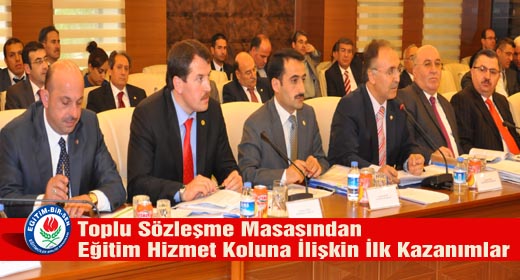 Memur sendikalari ile hükümet arasinda, memurlarin 2012 ve 2013 yillarina iliskin mali ve sosyal haklarinin belirlenecegi toplu sözlesme görüsmelerinin 6. oturum sona erdi. Egitim-ögretim ve bilim hizmet kolu tekliflerinin görüsüldügü oturumda ek ödeme ile birlikte mali konularda sunumlar yapildi. Müzakere ve pazarliklar yapildigi oturumda hizmet kolu tekliflerimizden 10 karara baglandi.