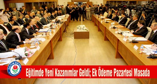 Memur sendikalari ile hükümet arasinda, memurlarin 2012 ve 2013 yillarina iliskin mali ve sosyal haklarinin belirlenecegi toplu sözlesme görüsmelerinde bugün 7. oturum gerçeklestirildi. Dün yapilan pazarliklar sonucu karara baglanan 10 maddenin ardindan bugün yapilan egitim-ögretim ve bilim hizmet kolu tekliflerinin görüsüldügü oturumda “Ek Ödeme” ya da “Egitim Ögretim Tazminati/Üniversite Ödenegi” konusunda taleplerimizi tekliflerimiz dogrultusunda yineledik. Bakan Çelik, “Ek Ödeme-Egitim Ögretim Tazminati ve Üniversite Ödenegi” konularinda Kamu Isveren Heyeti olarak tekliflerini Pazartesi günü masaya getireceklerini söyledi.