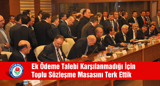 30 Nisan 2012’de baslayan toplu sözlesme sürecinde son oturum bugün yapildi. Hükümetin 666 sayili KHK ile magdur ettigi ögretmen ve ögretim elemanlarinin magduriyetinin giderilmesi için masaya getirdigimiz ek ödeme teklifimizin Kamu Isveren Heyeti tarafindan karsilanmamasi üzerine masayi terk ettik.
