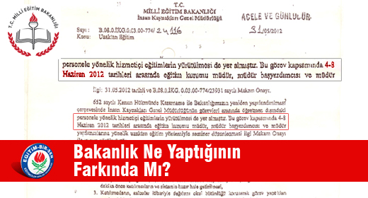 Bu yazi, Bakanligin egitim kurumlarindaki pratikten habersiz gibi hareket ettigini göstermektedir. Egitim-ögretim dönemi içerisinde, egitim kurumlari yöneticilerinin is yogunlugunun en fazla oldugu günlerde, yöneticilerin seminere mecbur edilmesi, dönem sonu islerinin yetismemesine neden olabilecek bir durumdur. Karne haftasi, yöneticilerin nefes almakta bile zorlandigi bir haftadir. Bu süreçte yöneticiler diger görevlerinin yani sira notlarin girisi ve karnelerin hazirlanmasi gibi önemli görevler yürütmektedir. Bu haftada yöneticilerin seminere alinmasi son derece yanlistir. Bu durum, aksakliklarin yasanmasina da neden olabilecektir.