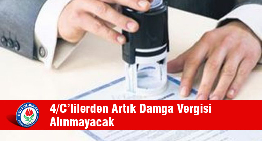 Toplu sözlesme masasina tasidigimiz teklifler arasinda yer alan 4/C’lilerden alinan Damga Vergisi’nin kaldirilmasina yönelik yasal düzenleme Resmi Gazete’de yayimlanarak yürürlüge girdi. Buna göre, 4/C grubunda çalisanlardan alinan Damga Vergisi kaldirildi. Resmi Gazete’de yayimlanan ‘Amme Alacaklarinin Tahsil Usulü Hakkindaki Kanun’ basligi altinda yer alan degisikligin 17. maddesine göre bundan sonra söz konusu çalisan grubundan Damga Vergisi alinmayacak.