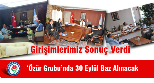 Milli Egitim Bakan Yardimcisi Orhan Erdem ve Müstesar Emin Zararsiz ile birçok görüsme yaparak, özür grubu atamalarinda magduriyet yasanmamasi için 30 Eylül tarihinin baz alinmasi talebinde bulunmustuk.