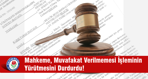 Eskisehir 1. Idare Mahkemesi, 2011 Yili Dikey Geçis Sinavi ile (Elazig) Firat Üniversitesi Mühendislik Fakültesi Makine Mühendisligi bölümünü kazanarak, fakülteye kaydini yaptiran ve egitimini sürdürebilmek amaciyla Firat Üniversitesi Rektörlügü’ne muvafakat yoluyla atanma talebinde bulunan Bilecik Üniversitesi Mühendislik Fakültesi Sögüt Meslek Yüksekokulu’nda memur kadrosunda görev yapan üyemizin talebine yüksekokul müdürlügü tarafindan olumsuz cevap verilmesi üzerine açtigimiz davayi karara baglayarak, islemin yürütmesini durdurdu.