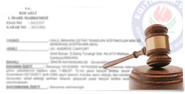 Adıyaman’ın Sincik İlçesi Haciyan İlköğretim Okulu Müdür Yardımcısı iken Bakanlık onayı ile 2005 yılından itibaren Sincik İlçe Milli Eğitim Müdürlüğü’nde Şube Müdürü olarak geçici görevlendirilen üyemiz hakkında düzenlenen soruşturma raporunda, üyemize 2005-2009 tarihleri arasında ödenen geçici görev yolluklarının geri alınması yönünde getirilen mali teklif doğrultusunda söz konusu bedel toplamı olan 7.366,67 TL’nin yasal faiziyle birlikte tahsili amacıyla düzenlenen işlemin iptali talebiyle Kocaeli 1. İdare Mahkemesi’nde açtığımız dava karara bağlandı.