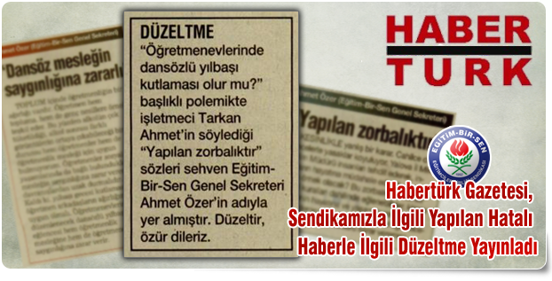 18 Kasım Pazar Günü Habertürk Gazetesi’nin Polemik sayfasında Yalova Öğretmenevi’nde yılbaşı gecesi dansöz oynatılacağı yönündeki haberler üzerine değerlendirmede bulunan Genel Sekreterimiz Ahmet Özer’in “Dansöz, mesleğin saygınlığına zarar verir” yönündeki açıklamasının dışında işletmeci Tarkan Ahmet’in yaptığı “Yapılan Zorbalıktır” şeklindeki açıklamanın da sehven Genel Sekreterimiz Ahmet Özer ismiyle verildiğini görmemiz üzerine Habertürk Gazetesi’yle iletişime geçtik. Görüştüğümüz gazete yetkililerine, Eğitim-Bir-Sen’in bu konulardaki duruşunun belli olduğunu hatırlatarak, öğretmenlik mesleğinin saygınlığına zarar vereceğini düşündüğümüz bir konuda duruşumuza ters bir açıklamada ismimizin geçmesinin camiamız hakkında yanlış anlamalara neden olabileceğini, bu nedenle düzeltme yayınlanması gerektiğini ifade ettik. Talebimizi haklı bulan Habertürk Gazetesi, bugün Polemik sayfasında düzeltme yayınlayarak yapılan hatadan dolayı özür diledi. Habertürk Gazetesi tarafından yapılan düzeltmede; “Öğretmenevlerinde dansözlü yılbaşı kutlaması olur mu?" başlıklı Polemikte işletmeci Tarkan Ahmet'in söylediği "Yapılan zorbalıktır" sözleri sehven Eğitim-Bir-Sen Genel Sekreteri Ahmet Özer'in adıyla yer almıştır. Düzeltir, özür dileriz.” denildi.