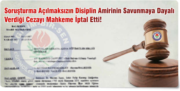 Mahkeme, 2011/1887 esas ve 2012/1814 sayılı kararında, “… disiplin amirlerince disiplin cezasına konu olabilecek eylemin tespiti halinde usulüne uygun olarak soruşturma açılarak yasal süresi içinde soruşturmanın tamamlanmasını müteakip oluşturulan raporun yönetmelik hükmünde belirtilen sorumluluk çerçevesinde değerlendirilerek ilgili hakkında işlem tesis edilmesi gerekeceği açıktır. Olayda, disiplin amiri olan Havran İlçe Milli Eğitim Müdürü tarafından savunması alındıktan sonra aynı disiplin amiri tarafından dava konusu işlemin tesis edildiği anlaşılmaktadır. Bu durumda davacı hakkında soruşturmacı tayin edilip soruşturma raporu alındıktan sonra disiplin amirince cezalandırılması konusunda bir ceza verilmesi gerekirken, olayda soruşturmacı tayin edilmeksizin ve usulüne uygun bir soruşturma yapılmaksızın disiplin amirince davacının doğrudan savunması alınarak tesis edilen dava konusu disiplin cezası işleminde ve bu işleme karşı yapılan itirazın reddine ilişkin işlemde hukuka uyarlık bulunmamaktadır” ifadelerine yer vererek, dava konusu cezayı iptal etti.
