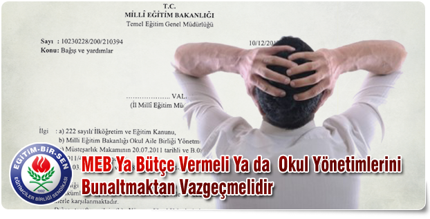 Milli Eğitim Bakanlığı, okulların personel ihtiyacı ve günlük rutin giderleri karşılanmadığı ve herhangi bir bütçe verilmediği için Okul Aile Birlikleri marifetiyle toplanan bağışlarla ayakta durmaya çalışan okullara, ya bütçe vermeli ya da okul yönetimlerini bunaltmaktan vazgeçmelidir.