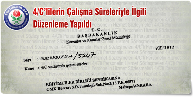 Toplu sözleşme görüşmeleri sonrası Kamu Görevlileri Hakem Kurulu Kararı’yla hüküm altına alınan 657 sayılı Kanun’un 4/C maddesi kapsamında istihdam edilen personelin çalışma sürelerinin 11 ay 28 gün olması hususunda ilgili mevzuatında değişiklik gerçekleştirilmiştir.