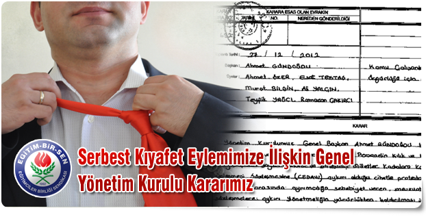 Kamu Kurum ve Kuruluşlarında Çalışan Personelin Kılık ve Kıyafetine Dair Yönetmeliğin, Anayasa, 657 sayılı Kanuna ve Birleşmiş Milletler Kadınlara Karşı Her Türlü Ayrımcılığın Önlenmesi Sözleşmesine (CEDAW) aykırı olduğu cihetle protesto etmek ve kamu çalışanları arasında ayrımcılığa sebebiyet veren, mevzuata ve uluslararası sözleşmelere aykırı Yönetmeliğin yürürlükten kaldırılması için kamuoyu bilinci oluşturmak amacıyla, 02.01.2013 tarihinde işyerlerine serbest kıyafetle gidilmesine ve çalışılmasına, söz konusu karara Sendikamızın yönetici ve üyelerinin katılımının sağlanması ile tüm şube ve temsilciliklerimiz aracılığıyla kamuoyuna duyurulmasına karar verilmiştir.