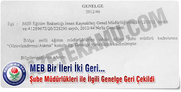 Milli Eğitim Bakanlığı İnsan Kaynakları Genel Müdürlüğü 29.12.2012/250926 sayılı Bakan Adına Müsteşar M. Emin Zararsız imzalı yazı ile 2012/44 sayılı İl/İlçe Milli Eğitim Müdürlüklerine tahsis edilen Şube Müdürü kadrolarına “Görevlendirme/Atama” konulu ilgi genelgeyi yürürlükten kaldırdığını duyurdu.