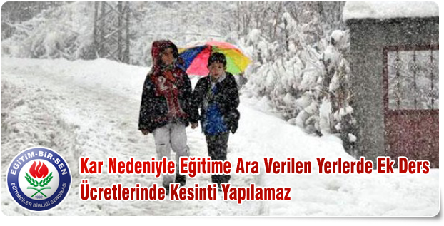 Eğitim-Bir-Sen’in Toplu Sözleşme kazanımlarından olan söz konusu karar gereği; kar yağışı nedeniyle eğitime ara verilen il ve ilçelerde görev yapan eğitim kurumu yöneticileri ile öğretmenlerin, bu sürelerde üzerlerinde bulunan aylık karşılığı ders, varsa ek ders, ders niteliğinde yönetim, hazırlık ve planlama görevlerini yapmış sayılacakları için ek ders ücretlerinde herhangi bir kesinti yapılmadan ödeme yapılması gerekmektedir.