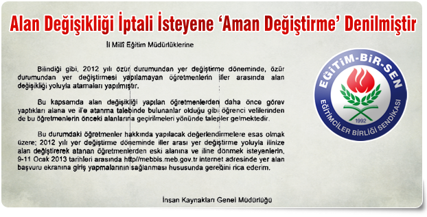 Alan değişikliği iptalinde; 2012 yılı öğretmenlerin il içi alan değişikliği sürecinde yaşanan karmaşa ve uygulamada birlikten uzak tasarruflar ortada iken; alan değişikliği başvuru sürecinde, değişiklik talebinin iptalini talep ederek bu amaçla iptal dilekçesi verenlerden, dilekçeleri çeşitli sebeplerle il/ilçe milli eğitim müdürlüklerine ya da Bakanlığa ulaştırılmayanların iptal talepleri yerine getirilmemiş, kişiler yargıya yönlendirilmiştir. Hâlbuki bu durumda olanların alan değişikliği iptal taleplerinin karşılanması gerekirdi. Hukuken haklı olan bir talep göz ardı edilmiştir.