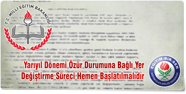 Milli Eğitim Bakanlığı’na bir yazı göndererek, özür durumuna bağlı yer değiştirmelerin yarıyıl tatilinde sonuçlanabilmesi için, Şubat 2012’de yapılan ilk atamaları da kapsayacak şekilde özür durumuna bağlı yer değiştirme kılavuzunun bir an önce yayınlanmasını istedik.