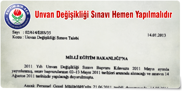 Milli Eğitim Bakanlığı’na yazılı müracaatta bulunarak, 2011 yılı Ağustos ayında yapılacağı duyurulan ve önce ertelenip daha sonra iptal edilen unvan değişikliği sınavının bir an önce yapılması için gerekli çalışmaların başlatılarak teknisyen, programcı, tekniker, hemşire, mimar, mühendis, psikolog, sosyal çalışmacı, fizyoterapist, mütercim ve benzeri unvanlara yönelik Unvan Değişikliği Kılavuzu’nun biran evvel yayınlanmasını, bu sınavı bekleyen çalışanların mağduriyetinin giderilerek konuyla ilgili sendikamıza bilgi verilmesini istedik.