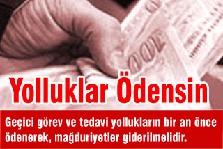 Bulunduklari il disindaki hastanelere giden memur ve birinci derece yakinlarinin çogu borçlanarak gidip gelmektedir. Agir hastalari oldugunu da düsündügümüzde, egitim camiasi mensuplarinin magduriyetinin ne boyutta oldugu daha net anlasilacaktir. Yolluklardaki sikintilarin giderilmesi için Emniyet Genel Müdürlügü ve Milli Savunma Bakanligi’nda oldugu gibi yolluk ödeme fonksiyonel kodlarinda degisiklik yapilarak tedavi, geçici görev ve sürekli görev yolluklarinin kodlarinin degistirilmesini Milli Egitim Bakanligi’ndan daha önce talep etmistik. Ayrica tedavi ve geçici görev yolluklarinin ödenmesi için Milli Egitim Bakanligi yetkilileri ile yaptigimiz görüsmelerde, ödenek olmadigi, Maliye Bakanligi’nin ödenek ayirmasi gerektigi ifade edilmistir.