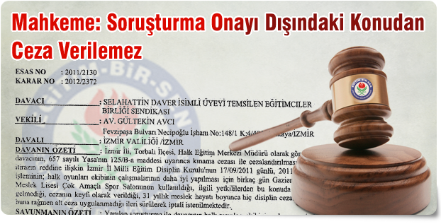Eğitim-Bir-Sen olarak, İzmir’in Torbalı İlçesi Halk Eğitim Merkezi Müdürü olarak görev yapan üyemizin, 657 sayılı Kanun’un 125/B-a maddesi uyarınca kınama cezası ile cezalandırılmasına yaptığı itirazın reddine ilişkin İzmir İl Milli Eğitim Disiplin Kurulu’nun 17.09.2011 günlü 2011/90.1 sayılı işleminin iptali için İzmir 1. İdare Mahkemesi’nde dava açmıştık.