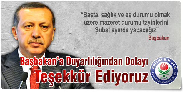 Başbakan Recep Tayyip Erdoğan, bugün yaptığı açıklamada, “Öğretmenlerin mazeret atamaları yılda bir kez yaz ayında yapılıyordu. Bu duruma gelmiştik. Başta sağlık ve eş durumu olmak üzere, mazeret durumu tayinlerini Şubat ayında yapacağız. Bunun da öğretmenlerimize hayırlı olmasını diliyorum” demiştir.