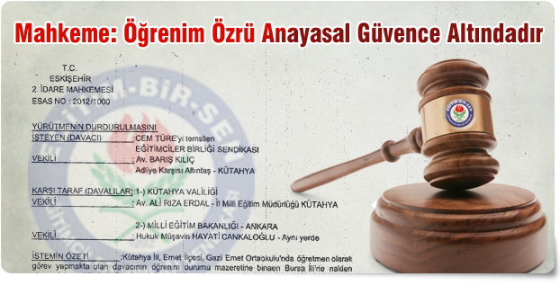 Eskişehir 2. İdare Mahkemesi, Kütahya’nın Emet İlçesi Gaziemet Ortaokulu’nda öğretmen olarak görev yapmakta olan üyemizin, öğrenim durumu mazeretine binaen Bursa’ya naklen atanmak istemiyle yaptığı başvurunun reddedilmesi yönünde tesis edilen Kütahya İl Milli Eğitim Müdürlüğü işlemiyle, bu işleme dayanak oluşturan 06.09.2012 günlü, 41611 sayılı Milli Eğitim Bakanlığı işlemlerini, hukuka aykırı olduğu gerekçesiyle iptal etti.