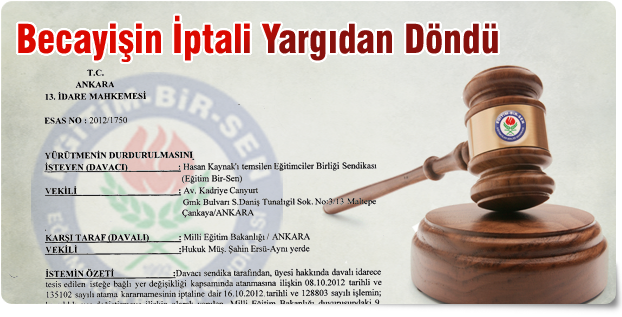 Ankara 13. İdare Mahkemesi, üyemiz hakkında davalı Milli Eğitim Bakanlığı’nca tesis edilen becayişe bağlı yer değişikliği kapsamında atanmasına ilişkin 08.10.2012 tarihli ve 135102 sayılı atama kararnamesinin iptaline dair işlemin, hukuka aykırı olduğu gerekçesiyle yürütmesini durdurdu.