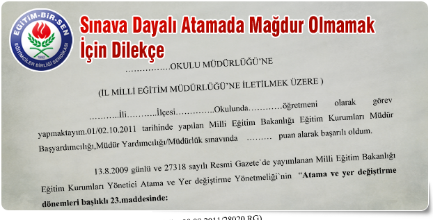 Yönetmelik gereği Ocak-Şubat aylarında sınavlı atama yapılmaktadır. Buna rağmen bazı valilikler atama takvimi açıklamadığı için atama bekleyen bazı üyelerimizin mağdur olma ihtimali söz konusudur. Üyelerimizin mağdur olmamaları için okullarına dilekçe ile başvurmalarında yarar vardır. Bu dilekçe ile üyelerimiz, 28 Şubat 2013 tarihine kadar ilgili valiliklerin duyuru yapmaması halinde hukuki süreci başlatabilirler. Üyelerimizin 28 Şubat’ta okullarına dilekçe ile başvurmaları gerekir.