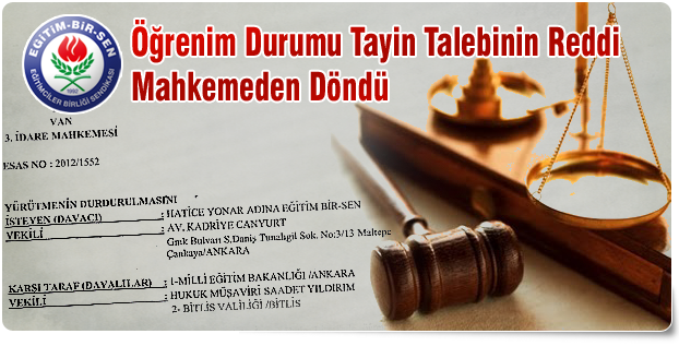 Bitlis Anadolu İmam Hatip Lisesi’nde öğretmen olarak görev yapan Eğitim-Bir-Sen üyesinin öğrenim durumu mazeretine binaen Çanakkale’ye naklen atanmak istemiyle yaptığı başvurunun reddedilmesi yönünde tesis edilen davalı idare işleminin, hukuka aykırı olduğu gerekçesiyle yürütmesi durduruldu.