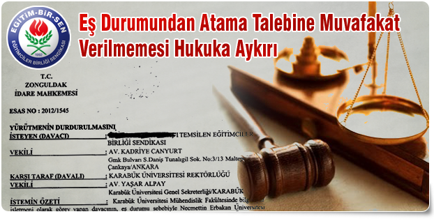 Zonguldak İdare Mahkemesi, Karabük Üniversitesi Mühendislik Fakültesi’nde bilgisayar işletmeni olarak görev yapan Eğitim-Bir-Sen üyesinin eş durumu sebebiyle Necmettin Erbakan Üniversitesi Rektörlüğü’ne atanma talebine muvafakat verilmemesine ilişkin Karabük Üniversitesi Rektörlüğü işleminin yürütmesini durdurdu.