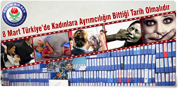 12 Eylül 2010 tarihinde yapılan Anayasa Referandumu’nda kadınlara pozitif ayrımcılık hakkı tanındığı halde, kamuda çalışma hayatında kadınlar arası ayrımcılığın sürüyor olması kabul edilemez. Temel hak ve özgürlüklerini kullanamayan başörtülü kadınlara erkek kontenjanından insan muamelesinin yapıldığı ülkemizde, Eğitim-Bir-Sen olarak 8 Mart’ın tüm ayrımcılıkların ve ötekileştirmelerin bittiği tarih olmasını istiyoruz.