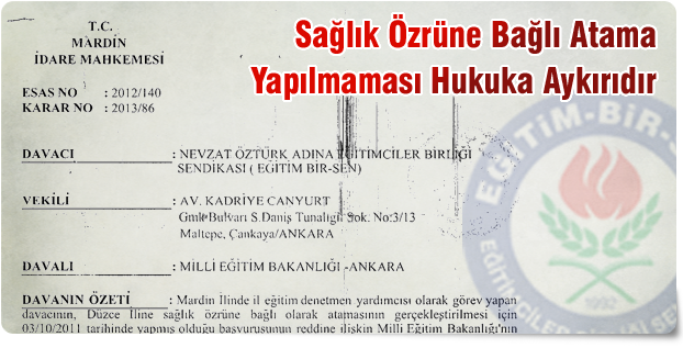 Eğitim-Bir-Sen, Mardin İl Eğitim Denetmen Yardımcısı olarak göreve başlayan üyesinin, Düzce’de ikamet eden ve yürüyemeyen, konuşamayan, temel ihtiyaçlarını karşılayamayan, yatağa bağımlı annesinin bakımını üstlenmek amacıyla Düzce’ye sağlık özrüne bağlı olarak atamasının gerçekleştirilmesi için yaptığı başvurunun reddine ilişkin Milli Eğitim Bakanlığı’nın işleminin hukuka aykırı olduğu gerekçesiyle açtığı davada Mardin İdare Mahkemesi, Bakanlığın işleminin iptaline karar verdi.
