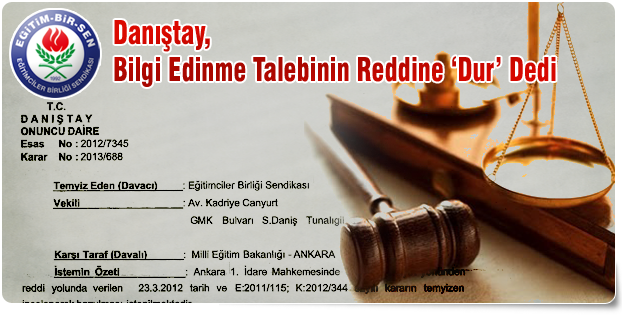 Danıştay, bilgi edinme talebini reddeden idare mahkemesi kararını bozdu. Eğitim-Bir-Sen’in, “kız teknik öğretim olgunlaşma enstitüsü, pratik kız sanat okulu ve kız teknik meslek lisesi gibi eğitim kurumlarına yapılan yönetici atamalarında; kimlerin, hangi eğitim kurumlarına ve hangi mevzuata göre atandıklarına” dair 4982 sayılı Bilgi Edinme Hakkı Kanunu kapsamında bilgi edinme talebinin Milli Eğitim Bakanlığı tarafından reddedilmesi üzerine, işlemin hukuka aykırı olduğu iddiasıyla açtığı davada, Ankara 1. İdare Mahkemesi, davanın reddine karar vermişti.