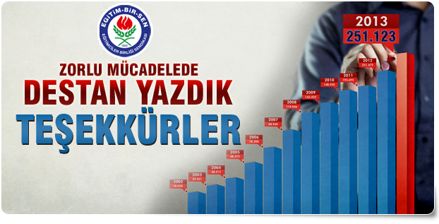 2009 yılında Milli Eğitim Bakanlığı bünyesinde aldığımız yetkinin açtığı yoldan ilerleyerek 2011 yılında genel yetkiyi alan sendikamız; 2012 yılında yetkiyi güçlendirirken, 2013 yılında karşımıza çıkan her türlü zorluğa rağmen peşimizden gelmeye çalışan sendika ile aradaki farkı daha da artırarak adeta destan yazmıştır.