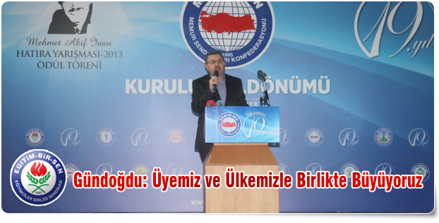 Sendikanın yaptığı önemli mücadeleleri anlatan Gündoğdu, “Toplu sözleşme hakkı sendikal mücadelemizde çalışma hayatı boyunca verdiğimiz en önemli mücadeleydi. Referandumdaki mücadelemiz sadece bir sendikal mücadele değildi. Toplu sözleşmeye de, toplumsal sözleşmeye de ‘evet’ sloganıyla bu milletin onlarca yıldır anasının ağlamaya devam ettiği gerçeğini paylaşarak artık referandumdan ‘evet’ çıksın, bu milletin anası ağlamasın demiştik. Allah’a hamdolsun bugün en sıkıntılı günlerde, Taksim krizinde bile ileri demokrasiyi, fikir hürriyetini, talepleri, en çok kızanlar bile, geleceğe dair planlarını konuşuyor. Dünün Türkiyesi’nde gelecek yoktu, darbeci paşalar üzüm asar gibi astıkları gençleri marifet olarak sayıyorlardı. İşte yeni Türkiye bu. Biz IMF’yi kovun derken, IMF’siz hayat olmaz diyen iş dünyası vardı. O gün onlar kâr ediyordu, bize sabredin deniliyordu. IMF gitti, onlar köşeyi dönmeye devam ediyor. Bugün 20-30 çevre sever gencin şapkasından kriz, kaos, darbeleri çıkartmak isteyenlerin başında bu iş dünyası varsa biz açıkça söylüyoruz, kriz varsa maaş bile almayalım ama kriz yoksa büyütüp şımarttıklarınız yerine işçiyi, memuru görecek, hakkımızı alacak günleri artık görelim diyorum. Yeni anayasa ve demokratikleşme, bu milletin referandumda gerçekleştirdiği 23 maddelik mükemmelliğin tamama ermesi için gerekli. Bunun için çalışıyoruz” diye konuştu.
