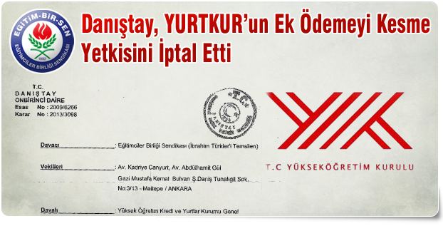 Eğitim-Bir-Sen’in, Yüksek Öğrenim Kredi ve Yurtlar Genel Müdürlüğü İzmir Bölge Müdürlüğü Akhisar Yurt Müdürlüğü’nde yönetim memuru olarak görev yapan üyesinin, 657 sayılı Devlet Memurları Kanunu’nun 125. maddesinin c fıkrasının e ve ı bentleri uyarınca 1/30 oranında aylıktan kesme cezası ile cezalandırılmış olması nedeniyle, 5102 sayılı Kanun’un 5. maddesi uyarınca verilen ek ödeme tutarının 6 ay süreyle kesilerek ödenen iki aylık tutarın adına borç çıkarılmasına ilişkin işlem ile bu işlemin dayanağı olan Yüksek Öğrenim Kredi ve Yurtlar Kurumu Genel Müdürlüğü Ek Ödeme Usul ve Esasları’nın 12. maddesinin c bendinin iptali talebiyle Danıştay 11. Dairesi’nde açtığı dava sonuçlandı.