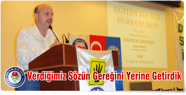 Bilgin, Eğitim-Bir-Sen Bursa Şubesi’nin İznik DSİ Tesisleri’nde düzenlediği teşkilat eğitim seminerine katıldı. Şube yönetimi, ilçe yönetimleri ve kadınlar komisyonu üyelerinin katılımıyla gerçekleştirilen seminerin açılışında konuşan Murat Bilgin, 2014 için öğretmenlere toplamda net olarak 278 TL zam aldıklarını belirterek, “Yüzde 14’lük net zam birilerinin 28 Şubatvari ayak oyunlarına heba edilmeyecek kadar değerlidir. Bu kazanımların karşılığı başı dik olmak, alnı açık olarak gelecek on yıllara yürümektir. 28 Şubat artıklarına artık pabuç bırakmayın” şeklinde konuştu.