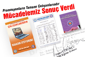 Promosyonlarin tamaminin çalisanlara verilmesi yönündeki mücadelemiz sonuç verdi. Milli Egitim Bakanligi’nda yetkili sendika olarak katildigimiz Kurum Idari Kurulu toplan- tisinda gündeme getirerek, imza altina aldigimiz, “Çali- sanlara, maaslari karsiliginda bankalarca verilen promos- yonlarin tamaminin verilmesi” karari, Milli Egitim Bakanligi’nin konuyla ilgili genelgeyi yayinlamasiyla uygulamaya girdi.